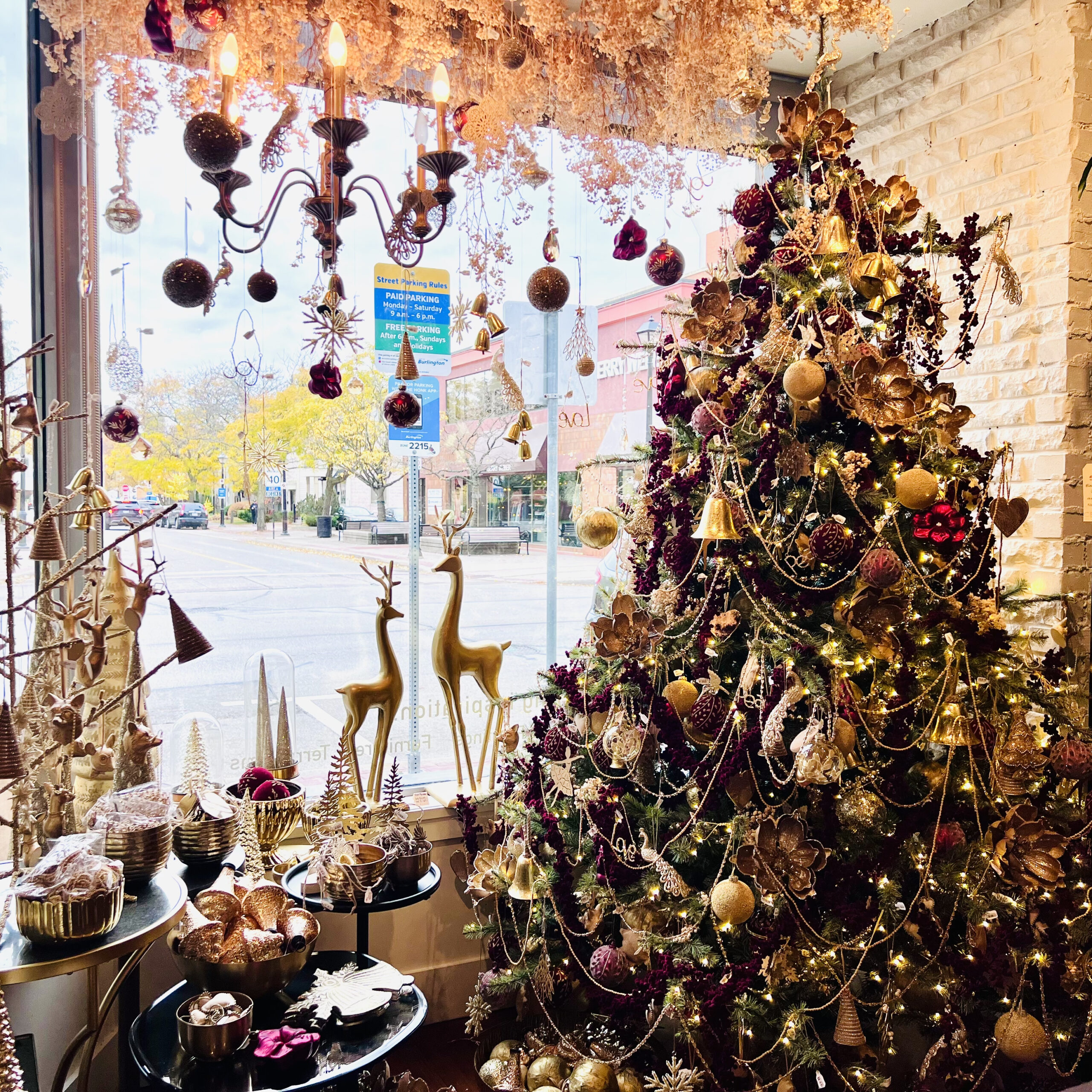 Our gold and burgundy section is timeless holiday cheer. The warm metallic and deep red tones fill the space with a rich and cozy glow. Each ornament adds sophistication with a touch of warmth. This display is made for those who love classic elegance.